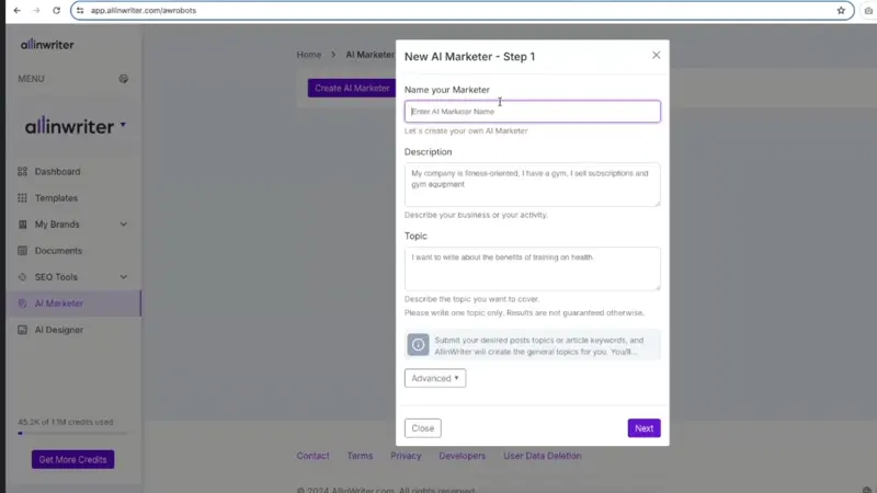 Funcția AI Marketers de la AlliWriter îți va permite să redactezi, programezi și publici automat conținut extraordinar.